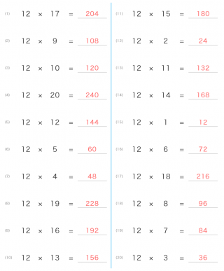 小学2年生小学3年生小学4年生小学5年生小学6年生算数九九掛け算一段ごとインド式20の段の掛け算ががばらばらで出題されます。