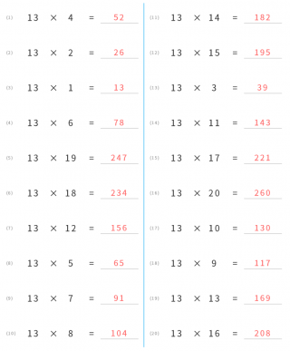 小学2年生小学3年生小学4年生小学5年生小学6年生算数九九掛け算一段ごとインド式13の段の掛け算ががばらばらで出題されます。