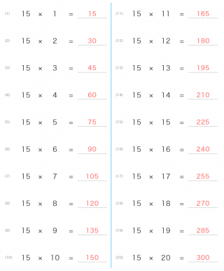 小学2年生小学3年生小学4年生小学5年生小学6年生算数九九掛け算一段ごとインド式15の段の掛け算が順序通りに出題されます。