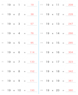 小学2年生小学3年生小学4年生小学5年生小学6年生算数九九掛け算一段ごとインド式19の段の掛け算ががばらばらで出題されます。