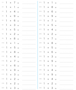 小学2年生算数九九掛け算一段ごと1の段の九九がばらばらで出題されます。