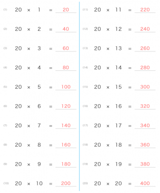 小学2年生小学3年生小学4年生小学5年生小学6年生算数九九掛け算一段ごとインド式20の段の掛け算が順序通りに出題されます。