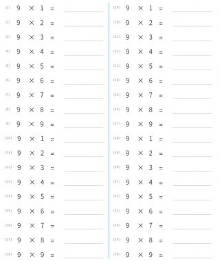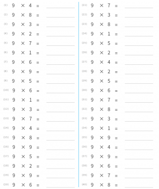 小学2年生算数九九掛け算一段ごと9の段の九九がばらばらで出題されます。