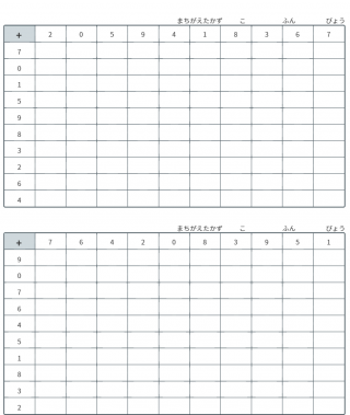 小学1年生算数ます足し算繰り上がり0~9の足し算が10ます出題されます。