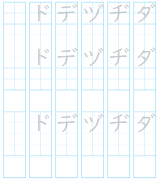 小学1年生五十音 カタカナ書き取りカタカナ【ダ行】の なぞり書き練習です。