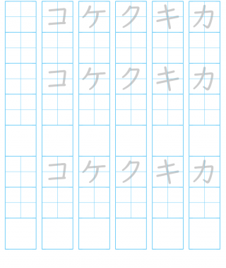 小学1年生五十音 カタカナ書き取りカタカナ【カ行】の なぞり書き練習です。