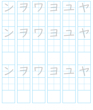 小学1年生五十音 カタカナ書き取りカタカナ【ヤ行】【ワ行】の なぞり書き練習です。
