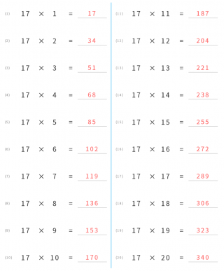 小学2年生小学3年生小学4年生小学5年生小学6年生算数九九掛け算一段ごとインド式17の段の掛け算が順序通りに出題されます。
