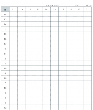 小学3年生小学4年生小学5年生小学6年生算数ます掛け算インド式11~20の段のます掛け算が順序通り200ます出題されます。